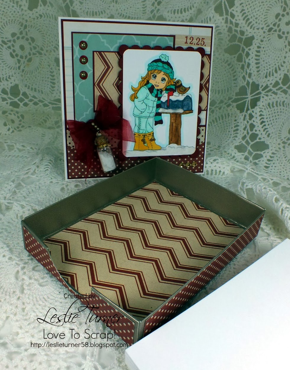I used tiny red and deep red gemstones on the lacey border, and a slightly larger deep red one in the center of the ornament. I really like the simple elegance of this! The inside is blank.